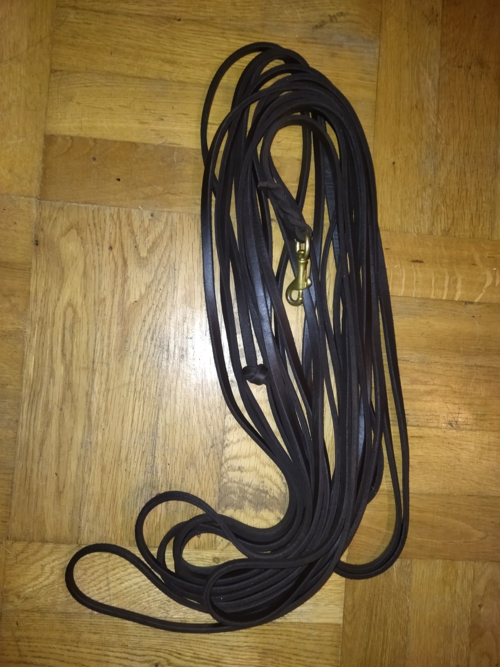 Mein Tipp für jeden Anfänger: Beginnt mit einer Schleppleine, die ihr sowieso schon habt – irgendetwas zwischen 5 und 10 Metern – lieber ein bisschen kürzer als länger. Und dann probiert ein bisschen herum, schaut mal, mit was die anderen so arbeiten, testet euch durch, macht erste Erfahrungen… und irgendwann dann, wenn ihr wisst, dass ihr dabei bleiben wollt, dann investiert ihr in die Leine, die in Material und Länge zu euch als Team passt.