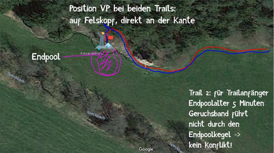 Die Aufgabe für das fortgeschrittene Team war ein klassisches Endpoolrätsel. Der direkte Weg über den Endpoolkegel zur VP war nicht möglich – hier ragte die Felswand steil empor. Das Team musste folglich in den älteren Geruch wechseln, um sich zur VP zu arbeiten. Der Hundeführer musste hierzu erkennen, dass der Hund unterhalb der Felswand den Endpoolkegel anzeigte und Rückschlüsse auf den Trailverlauf ziehen.