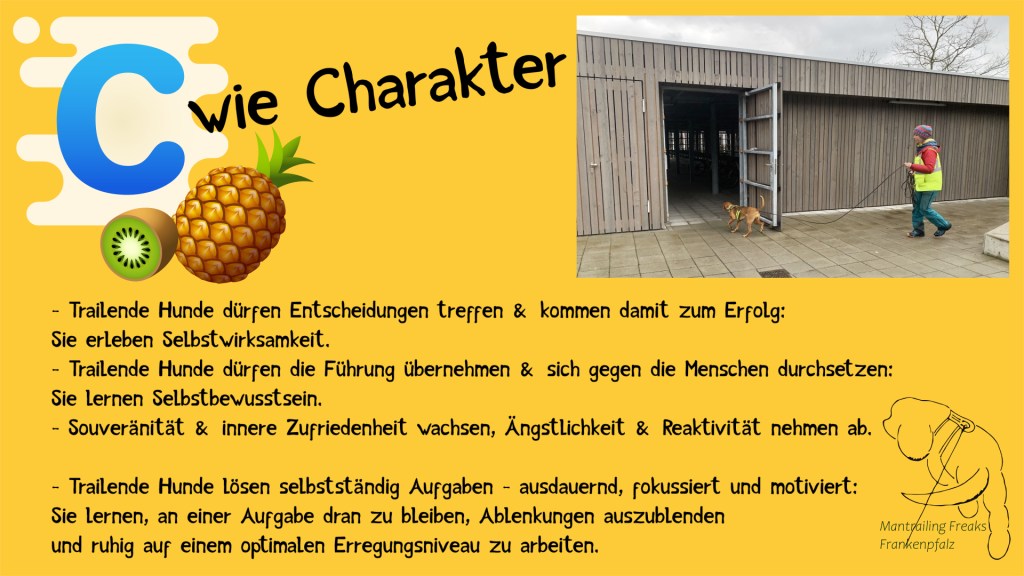 Hunde arbeiten mit ihrer Nase dort, wo der Geruch ist. Mit zunehmender Erfahrung lernt der Mantrailer, Geruchsbilder zu interpretieren und entwickelt Lösungsstrategien für schwierige Geruchsrätsel. Dabei darf jeder Hund seine individuellen Stärken ausbauen.