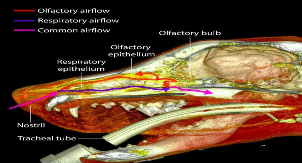 Hunde riechen ca. 1 Millionen x besser als wir Menschen. Über bewegliche Nasenmuscheln können sie bestimmen, aus welcher Richtung ein Geruch kommt und extrem viele Rezeptoren und ein großes Riechhirn ermöglichen eine unvorstellbare Riechleistung. Auf dem Trail bestimmen Hunde die Spurrichtung über das Spuralter und nehmen dabei einen Altersunterschied von fünf Sekunden wahr.